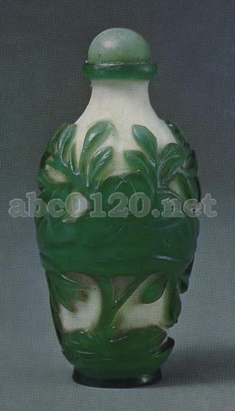 清 高さ8cm 腹径3.6cm 円形の器身は白色で、緑色料の文飾が施されている。胴の周りに花と竹を一株づつ彫り、間を包袱形の文飾で束ね、上端に一匹の蝙蝠を配している。松緑石の蓋がついている。出所:『故宮鼻煙壺選崒』