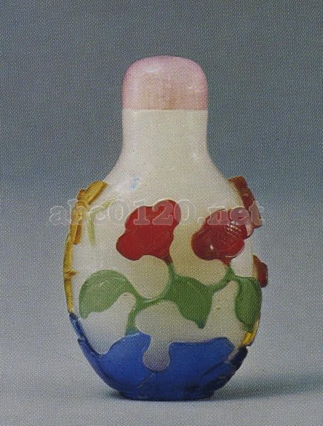 清 高さ4.8cm 幅3.3cm 厚さ2.3cm 扁円形の器身は白色で、紅・黄・藍・緑色料による文飾が施されている。花蝶を浮彫りし、太湖石、霊芝を配している。象牙の匙がついている。出所:『故宮鼻煙壺選崒』
