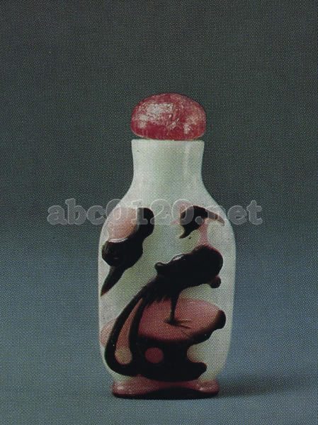 清 高さ5.5cm 幅2.5cm 厚さ1.5cm 扁円形の器身は白色で、黒・粉紅色料による文飾が施されている。一面には丹鳳朝陽、他面には牡丹一株を彫っている。碧璽の蓋と象牙の匙がついている。出所:『故宮鼻煙壺選崒』