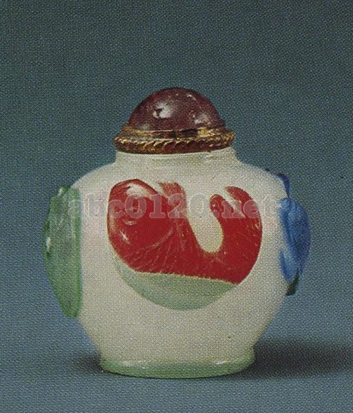 清 高さ3.5cm 腹径3.3cm 器身はまるく白色で、紅・黄・藍・緑色料による文飾が施されている。胴部の周りには四尾の魚が彫られている。碧璽を象嵌した銅の蓋と銅の匙がついている。出所:『故宮鼻煙壺選崒』