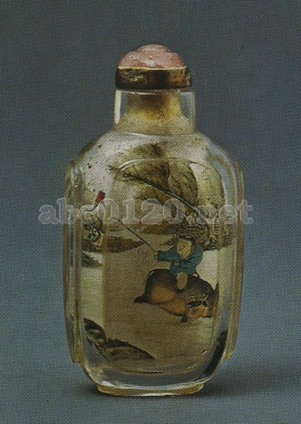 器身は扁円形で、内壁には人物と山水が彩絵されている。一面は童子牧牛図であり、他面は漁人泛舟図である。裏面の上方に行書の題識「乙西長夏写於京師、藕香書軒 周楽元」があり、下に篆書の楕円印「元印」が押されている。碧璽を象嵌した銅の蓋と銅の匙がついている。(玻璃は透明ガラスの名称)。出所:『故宮鼻煙壺選崒』