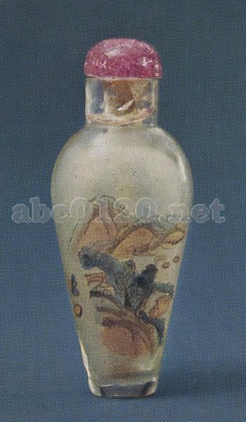 清 高さ5.9cm 幅2.3cm 厚さ2cm 器身は扁円形で、内壁の一面には山水、他面には博古図を彩絵している。碧璽の蓋と象牙の匙がついている。出所:『故宮鼻煙壺選崒』