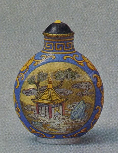 扁円形の器身で、藍色地に蟠枝花形の図案が彩絵され、頸部には回文が一周している。両面に間取り文が設けられ、なかは金地で、一面には瓊楼仙閣、他面には仙亭雲樹が描かれている。器底には「乾隆年製」四字の篆書の款を刻している。料製の蓋と象牙の匙がついている。出所:『故宮鼻煙壺選崒』