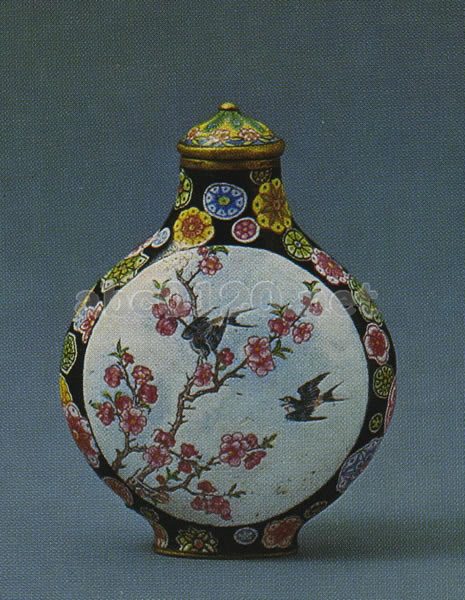 扁円形の銅胎?糸琺瑯器である。淡い藍地に蟠枝花を彩絵し、口縁の下と足部には如意雲文を各一筋めぐらしている。両面の間取り文のなかには画琺瑯の方法で美女と小児を彩絵し両側面の間取り文にも同じく画琺瑯により西方風景を描いている。器底には、二重方圏内に「乾隆年製」四字の楷書の款がある。珊瑚の蓋と象牙の匙がついている。(?糸琺瑯器とは、銅線で文様を描いたのち琺瑯質を填め込んで焼成した七宝の器)。出所:『故宮鼻煙壺選崒』
