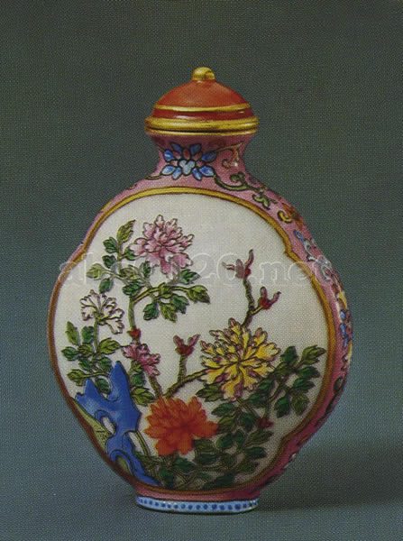 扁円形の器身で、粉地に蟠枝花文を彩絵し、足部には星点文を一筋めぐらしている。両面に間取り文を設け、一面には牡丹と太湖石を描き、他面には隷書の題識「錦繍堂中開画屏、牡丹紅間老松青、日烘始識三春麗、歳暮猶看百尺亭」があり、 下に篆書の「乾」「隆」の連珠方璽がある。器底には「乾隆年製」四字の篆書の款がある。瓷製の蓋と象牙の匙がついている。出所:『故宮鼻煙壺選崒』