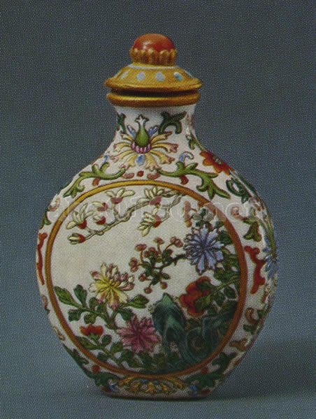 扁円形の器で、白地に蟠枝花を彩絵している。両面の間取り文内にはどちらも花卉を飾り、太湖石を配している。器底には、二重長方圏内に「乾隆年製」四字の款がある。瓷製の蓋と象牙の匙がついている。出所:『故宮鼻煙壺選崒』