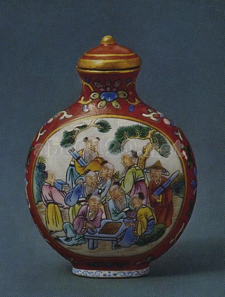 扁円形の器で、紫紅色の地に蟠枝花を彩絵し、足部に纏枝花を一筋めぐらしている。両面に間取り文を設け、一面には人物を描いてあり、他面には隷書の題識「翡滴螺峰絶点埃、幾間板屋□波開、為穿曲径通幽処、惹得遊人杖策来」と、下に篆書の「乾」「隆」の連珠方璽がある。 器底には「嘉慶年製」四字の篆書の款がある。瓷製の蓋と象牙の匙がついている。出所:『故宮鼻煙壺選崒』