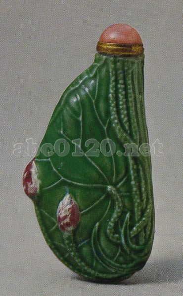 清 高さ7.3cm 幅3.6cm 厚さ1.7cm 扁円形の器身全体に緑色釉がかかり、荷(蓮)の枯葉状をなし、蓮の実と蕾が飾られている。珊瑚を象嵌した銅の蓋と象牙の匙がついている。出所:『故宮鼻煙壺選崒』