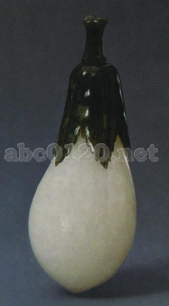 清 高さ8.7cm 幅3.4cm 厚さ3.1cm 白玉であるが微かに青味をおびている。器身は茄子形で、暗黒飴色の料製の帯がある。料製の蓋と象牙の匙がついている。出所:『故宮鼻煙壺選崒』