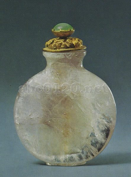 清 高さ6.6cm 幅4.5cm 厚さ1.5cm 扁円形の水晶の器身は透明感があり、淡い紫色を呈している。素朴で文飾はない。翡翠玉を象嵌した銅の蓋と鼈甲の匙がついている。出所:『故宮鼻煙壺選崒』