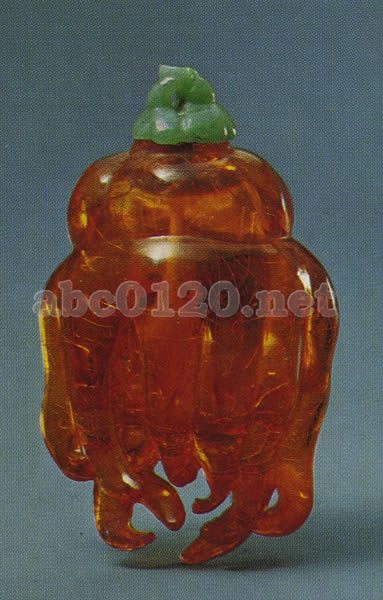 清 高さ7.3cm 幅4.4cm 厚さ2.4cm 仏手柑の形をした琥珀の器で、透明で金黄色を呈し、天然の氷裂文がある。蒂の形をした翡翠玉の蓋と象牙の匙がついている。出所:『故宮鼻煙壺選崒』