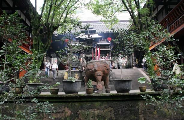 建福宮と天師洞の間にある。海抜は893m。両峰に挟まれるように建てられている。こじんまりした楼閣は、緑の木々の間に姿を見せたり見せなかったりする。ここに身をおけば、絵の中にでもいるかのような錯覚をさせる。楼閣の後では、さえずったり遊んだりするツルの群れが時々に見られる。右側の、両山を連ねるような大きな長い石は「天仙橋」と呼ばれ、言い伝えでは仙人が集うところであるという。出所:中国世界遺産「青城山ー都江堰」