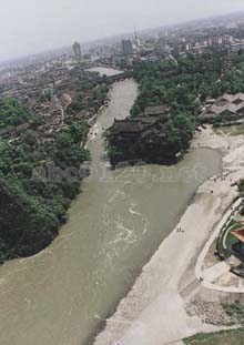 飛沙は都江堰の3大プロジェクトの1つで、ざつと見れば簡単だが、実のところ、成都平原を水害から守るのには知何なる工事であつてもこれに取つて代わられない。内江の河床より2.15m高い飛沙堰の役割は、内江の流量が宝瓶口流量の上限に達した時、増やした水を飛沙堰からあふれ出させることにある。特に酷い洪水が起きた場合は、土手が自然に崩壊し、ほとんどの流れを眠江本流に流させることもできる。もう1つの役割は、遠心力を巧みに利用し、上流から流されてきた土砂、栗石、甚だしくは数100k9の石をここから外江に排出し、内江の安全用水を確実に保障することである。出所:中国世界遺産「青城山ー都江堰」