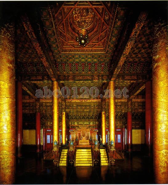 太和殿:俗に金鑾殿と呼ばれ、故宮の中心部にある。三大殿のメイン建築で、高さ8.13mの漢白玉の基礎に建てられた。幅11間、高さ35.05m、面積2377㎡の殿堂は、中国では現存する最大の木造殿堂である。殿堂の内外に計72本の柱に支えられ、雄大かつ豪華である。殿の中央に、栴檀で作られた九竜玉座は置いてあり、皇帝権力のシンボル。地面に4718枚の「金レンガ」が敷かれており、鏡のように平かでつるつるしている。皇帝の即位、詔書の頒布、皇后の冊立、皇帝の結婚式、出征詔書の宣布などの儀式はここで執り行われたいた。