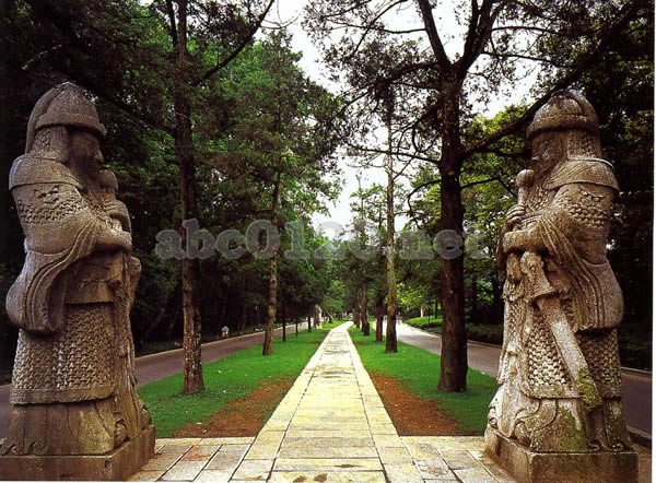 神道(参道)の長さは約1800m。そのうちの中段は石象路と呼ばれ、その両側には12組の石獣(それぞれ獅子、駱駝、象と馬の6種)が相向かうように立ち並んでいる。その後側に立つた高い華表は、雲龍の紋様が彫られた立派な立石である。北に伸びる神道の両側に、それぞれ4組の甲冑または蟒袍(竜紋の長衣)をまとった文臣武将の彫像がある。残念ながら、これらの彫像はすでに壊れている。石人も石獣も堂々とした体躯のもので、いずれも明代石刻芸術の高級品である。出所:中国世界遺産「明・清時代の皇室陵墓」