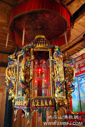 木製の灯は、高さ1.1m、直径70cm、洪椿坪寺にある。7角形を呈し、胴体に金色の龍を7匹飾つている。灯には、さまざまな形をする、精緻極める計500体の仏像が刻まれている。人々に驚嘆させるのは、仏像のほかに道教の像も描かれている。希に見る宗教法器である。民国初年に、重慶の職人が創ったものだ。年代はさほど古くないが、珍しい文物と言えよう。出所:中国世界遺産「峨眉山と楽山大仏」