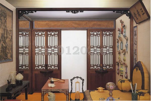 この次の間の間仕切り格子戸を開けると、明るい大窓に面した、間口、奥行ともにニメートルほどの部屋が「三希堂」の主室である。窓際半分が少し高く坐炕(オンドル)になっており、その東寄りに、宮廷を象徴する黄地に雲幅紋の絹地の広い座敷布団と背や肘をもたせかけるクッションが一組、この脇息の上に乾隆帝御題の「三希堂」の横額と「懐抱観古今、深心託豪素」の対聯が掛かっている。紫檀の坐卓と西の壁際の紫檀の小机、窓際の棚には、硯、筆、筆筒、水注等の文具と青玉、白玉、瑪瑙等貴玉の清玩が置かれ、壁面には華麗な釉彩壁瓶が掛けられている。いずれも文玩の逸品である。これらの器物の配置はほぼ乾隆帝当時のままで、乾隆帝は四〇数年にわたって、冬になるとこの小室で「三希」をひろげ観賞し、詩を書きつけていた。西側の方琮の山水画は、この五平方メートルの小室を大自然の中へと誘っている。坐炕の下手東側には、「三希堂法帖」を収めた一二個の紅木の箱が並んでいる。入口の格子戸は楠に彫刻をしたもので、この扉の上の欄間には、「三希堂記」が東西方向に長くかかっている。