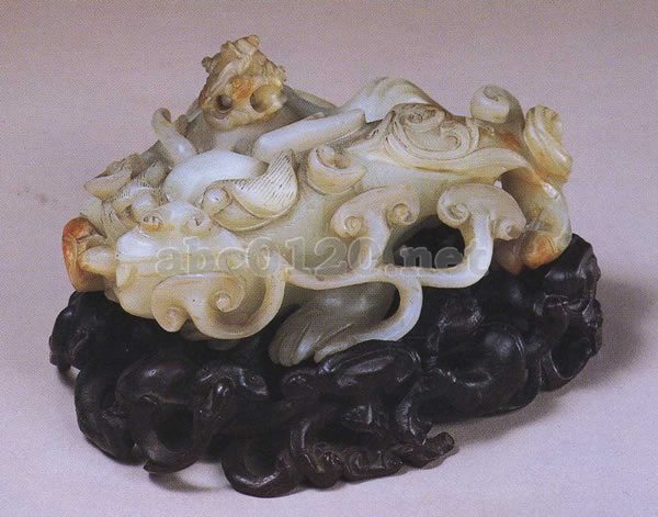 新彊地方の青玉を用いてつくつた獣形の水注。頂部には玉の色を生かして巻雲紋が彫られ、 異獣または瑞獣ともいうが、明の時代には縁起がいいとされた。明代の遺風がみられる、清初期の文房具の逸品である。出所:『北京博物院・清朝宮廷文化展』
