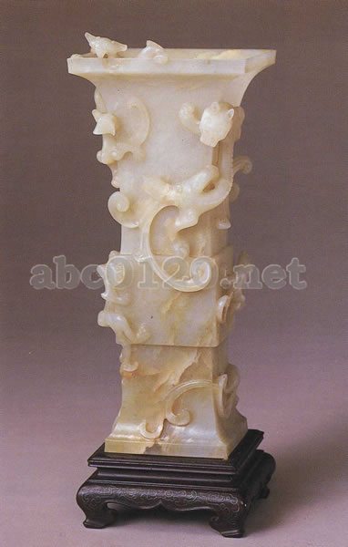 清中期 高22cm 口辺8.5×8.5cm 三希堂御物 龍の一種、螭を浮彫りしたもの。觚とは古代の酒器。清代にはに製の觚がかなりあって、一般に装飾品として花を挿すのに使われたりした。出所:『北京博物院・清朝宮廷文化展』