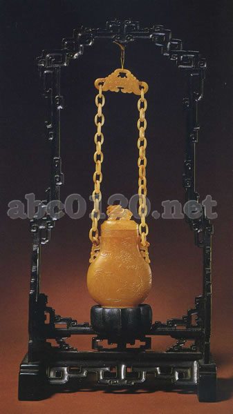 清中期 総高23cm 幅5.9cm 厚2.5cm 三希堂御物 ひと塊の黄色瑪瑙で提梁、鏈、卣を彫ったもの。枠は紫檀で、この提梁卣は宮廷の装飾品であった。出所:『北京博物院・清朝宮廷文化展』