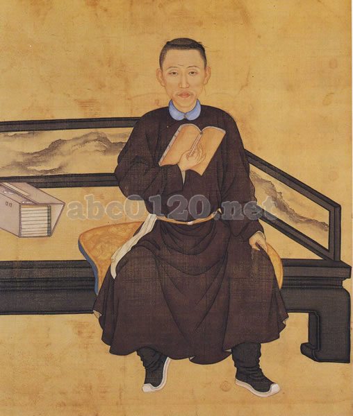 世宗愛新覚羅・胤禛は清の第三代皇帝、年号は雍正である。この絵についている黄色の絹の題簽には漢字と満州字で「世宗敬天昌運建中表正文武英明寛仁信毅大孝至誠憲皇帝」と書かれている。雍正皇帝が平服を着て、右手に書をもち端坐している。運筆挺秀にして色彩清雅、表情が生き生きと細密に描かれている。落款はない。出所:『北京博物院・清朝宮廷文化展』