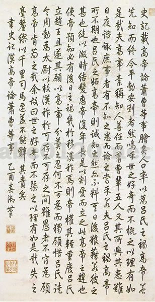 乾隆皇帝は四庫全書館を開いて一統志などの書籍の編纂を命じたり、諸帝の中で最も文武の抜んでた皇帝であった。書法を好み、詩をつくり、淳化軒を建てて淳化閣帖を収蔵したりした。当時は趙孟頫の書が貴ばれ、書法の形体が豊円潤秀なものにかわってきた。御筆「史史記」は乾隆皇帝が『史記』のなかの漢の高帝が蕭曹などを論じた内容を書いたものである。五十五歳の時の作で、円潤秀逸な書体に、趙孟頫、董其昌の書法風格をはっきり見ることができる。 これについて『(雨+妻)嶽棲卒談』は「饒平の象を承けると雖も、終に少なし雄武の風」と書いている。出所:『北京博物院・清朝宮廷文化展』