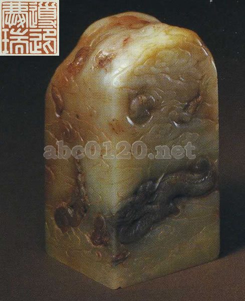 乾隆年間の印材の花、寿山石の印。石材の天然の形、文理、色を巧みに生かして雲海に遊ぶ、色の異なる五匹の龍を刻している。構想が巧妙であり、彫りが精美である。出所:『北京博物院・清朝宮廷文化展』