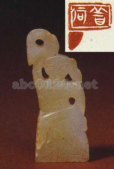 戦国時代の私印である。現代に伝わっている最古の私印は戦国時代のもので、多くは鋳型銅印である。戦国時代の玉の私印は大変珍らしい。たおやかな美しい舞い姿の紐は人の顔から衣服まで細かに精巧に刻られ、生き生きとしている。戦国時代の私印でこのような形のものはこれひとつしかない。戦国時代の私印は一般に姓名印、成語印、肖形印の数種に分けられるが、これは姓名印である。出所:『北京博物院・清朝宮廷文化展』
