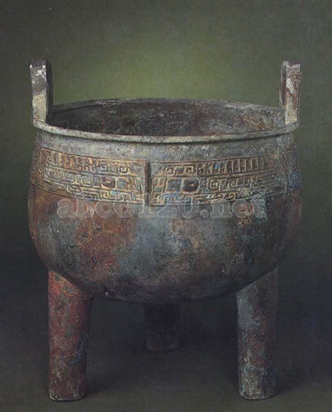 青銅器は古くは彜器といわれ、古代より建国の儀式に宗廟に供える礼器として鋳造され、歴代帝王の威容を象徴したものであった。このため清朝の皇帝もその収蔵をたいへん重視し、乾隆帝は命じて古器一五二七器の形態を精絵、銘文を(莫+手)写させて、『西清古鑑』四〇巻を刊行せしめた。この書が世に出てから鐘鼎文字の研究、金文の学が大いに盛んになり、近代の書法にも少なからぬ影響を与えた。出所:『北京博物院・清朝宮廷文化展』
