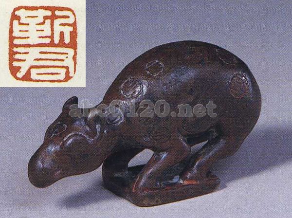 漢代の私印は中国の古璽印の中でも数が最も多く、内容も豊富で、鋳印もあれば、鑿印もあり、陰文、陽文あり、半分が陰文、半分が陽文のもの、人、動物、鳥虫が刻されているものもある。紐は一層豊富多彩で、よく見られる鼻紐、瓦紐、亀紐のほかに、象紐、蛙紐、辟邪(鎮守獣)紐などの動物紐などがあった。この漢印は端正俊雅、撲拙自然で、「靳君」の二字が上下に並んでいる。「靳」は姓、「君」は名である。紐は前膝を曲げた柔順な糜鹿で全身が環状斑紋で飾られ、造形が生き生きとして、如何にも可愛らしい。現在にはわっている古代の銅印で、鹿紐印章はめずらしい。出所:『北京博物院・清朝宮廷文化展』