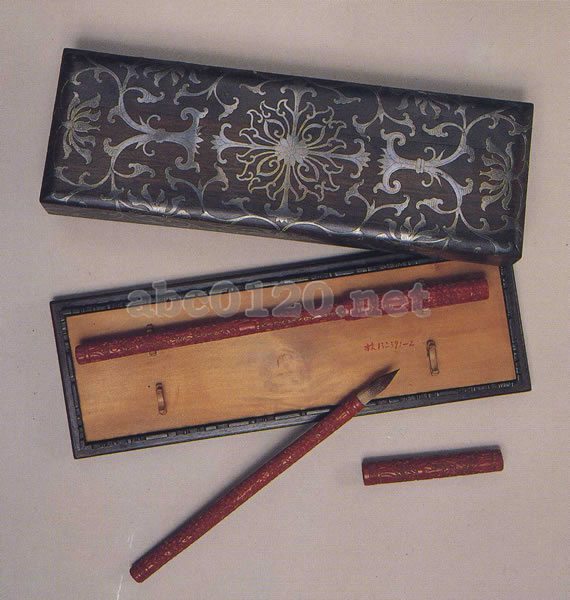 堆朱地に山水人物を彫刻した筆管をもつ筆である。細長い筆管全体に一幅の山水人物図を描き、その構図も新鮮で、明代の筆の中でも数少ない珍品のひとつである。筆の穂は貂毫で、玉蘭蕊型と呼ばれる穂形をしている。この筆は、紫檀木製の筆盒におさめられている。筆盒は銀片で蓮花紋様がはめこまれ、中には檀香木の筆座がすえられている。 そのつくりはなかなか手の凝ったもので、筆を一層豪華にしている。