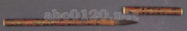 筆毫は野兎毛を使い、筆管は檀香本が用いられ、両端には着色した象牙がはめこまれている。筆管には蝙蝠、寿桃、万年竹、吉祥の雲が描かれ、福寿が象徴される。紋様は金で描かれ、朱、緑、真紅の色彩がうまく調和している。檀香木は又の名を旃檀といい、木質は硬く、香料にも使え、極めて貴重な木材ごある。出所:『北京博物院・清朝宮廷文化展』