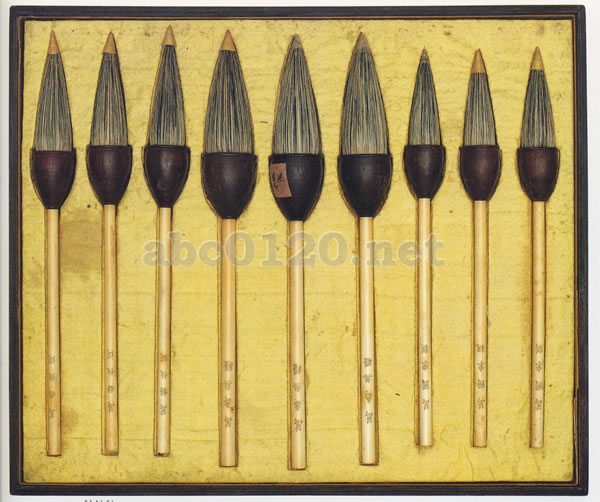 象牙管提筆は大中小の三種類、計九本からなっており、管にはそれぞれ線刻で楷書による「萬壽無疆」、「萬福攸同」、「萬国來朝」の文字が刻まれている。象牙の筆管は潔白で肌ざわりよく、管の下端に紅木の斗がつき、筆毫の太さを増し、多量の墨液をふくめる。鬃羊毛を用いた筆毫は黒と白があざやかである。九本の提筆はガラス張りの紅木の箱におさめられ、優雅で清楚な題字は湖筆のすばらしさをさらに高めている。出所:『北京博物院・清朝宮廷文化展』