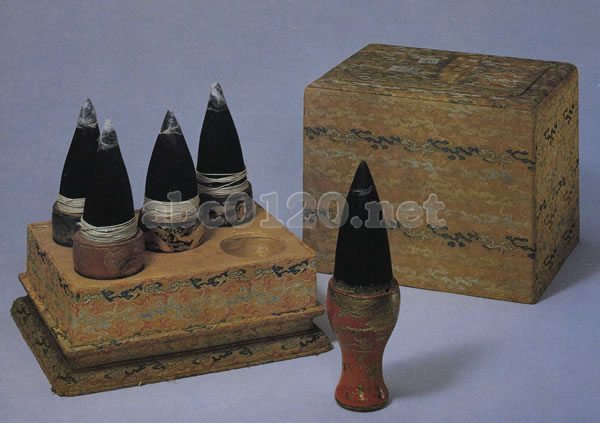 同じ形をした五本の抓筆は、筆管は本製で、木の台に紫、黄、緑、赤の漆を塗り、その上に金をもって、雲、蝙蝠、龍、鳳凰、自然などそれぞれ異る図案を描いている。筆の外形は太く短く、穂は鬃亳。亳はわりと硬く、大字に適している。筆を持つ時、わしづかみにすることから抓筆とよばれる。一式は錦の箱におさめられ、皇帝の御用品である。出所:『北京博物院・清朝宮廷文化展』