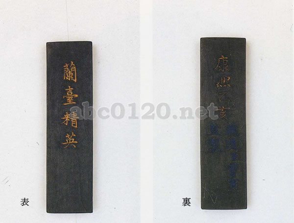 長方形の墨の表は「蘭臺精英」の四字で、填金してある。裏の上端には「康熙乙亥」の四字が同じく填金してあり、下には「織造臣曹寅監製」の款が二行にわたって青で人っている。字はいずれも楷書、陰文である。
