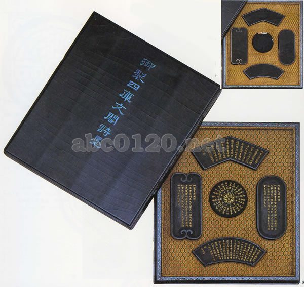 一式五笏のセットが螺鈿の漆箱に入っている。中央は円形の墨で、表には十二支が彫ってあり、裏は金の小楷書による御製七言詩になっている。 上磬(古代の打楽器の一種)の形をした墨で、表が楷書の御製文淵閣詩、裏が文淵閣図で、右側に楷書で「文淵閣墨」の文字が入っている。左の墨は雲頭長方形、表が楷書の御製文津閣詩、裏が文津閣図で、 その右側に楷書で「文津閣墨」の文字が入っている。右の墨は牛舌形、表が楷書の御製文源閣詩、裏が文源閣図で、 その右側に楷書の「文源閣墨」の文字が入っている。下の墨は扇形、表が楷書の御製文溯閣詩、裏が文溯閣図で、 その右側に楷書で「文溯閣墨」の文字が入っている。後者四つには御製詩に「臣彭元端敬書」の款が入り、左側に楷書の「大清乾隆年製」の文字がある。