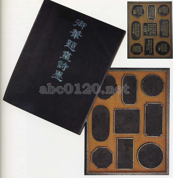 清の高宗弘暦、つまり乾隆帝は絵にたいへんな興味をもち、中国歴代の名画を大量に収集したが、特に愛着した絵には自分で詩をつけ、記録に残した。この墨は乾隆帝が詩をつけた名画の中から八人の画家の秀作を九幅えらび、原画と乾隆帝の筆跡で墨の型を膨り、つくりあげたもので、世に稀な珍品である。