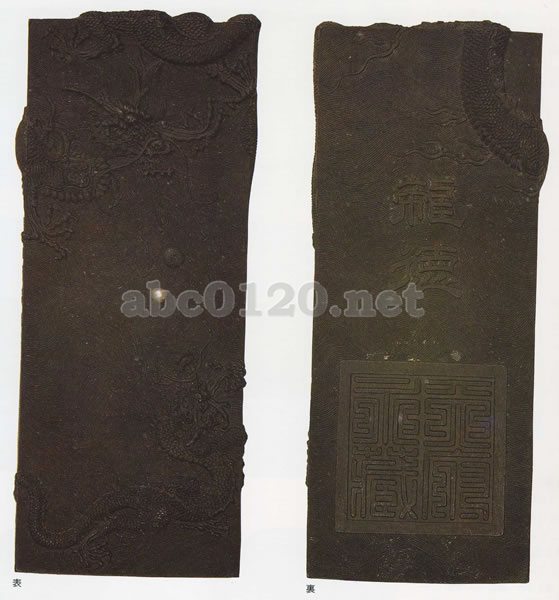 この墨は清宮内務府の御書処墨作所でつくったもの。清代の御墨は現存数からいえば乾隆年間のものが多い。形が精巧なこと、墨質が硬くて細かなこと、図案が緻密なこと、線に力のこもっていることなど乾隆時代の製墨レベルの高さを物語っている。出所:『北京博物院・清朝宮廷文化展』