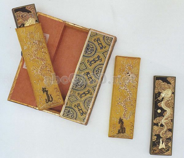 長方形の墨二笏を別々に小さな綸子の袋におさめている。表は雲紋を地にして、珠で遊ぶ龍を浅く浮彫りし、その下方が,皮になっている。裏は陰文篆書で「御墨」の二文字を彫り、題字にも模様にも金が塗ってある。綸子の袋は明るい黄色で、金色の龍戯珠図案が刺繍してある。出所:『北京博物院・清朝宮廷文化展』