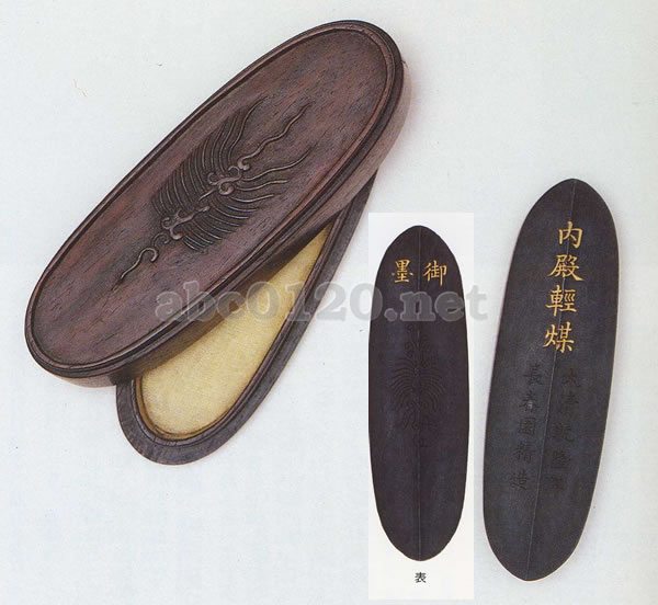 表裏両面とも縁のかどをたてた細長い楕円形で、中央に縦に高く稜線がある。表が楷書で「御墨」のニ字を彫り、填金してある。裏は楷書による「内殿軽煤」と「大清乾隆年長春園精造」の文字である。長春園というのは乾隆帝の御花園・圓明園の暢春園内にあった。出所:『北京博物院・清朝宮廷文化展』