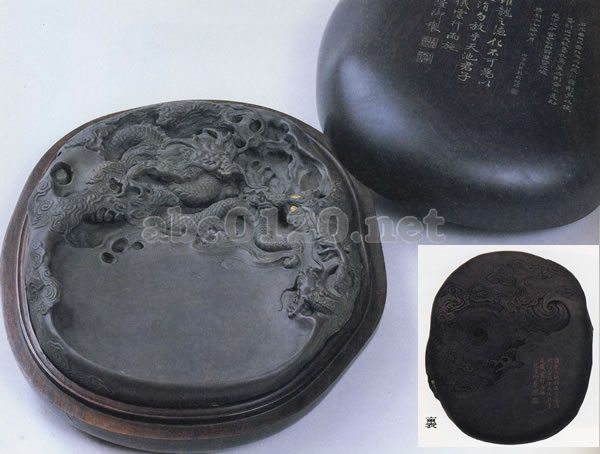 硯の左側面には「康熙十八年五月恭製小臣劉源」の銘が打たれており、乾隆帝はこの硯をことのほか賞讃し、四言絶句一首をしたため、硯の衷に刻んだ。硯は紫檀の硯盒におさめられ、箱もすぐれたもので、劉源自らの作品である。箱の面には蘇東坡の咏硯の文と、上述の乾降の御製の詩がしたためられ、蓋の内側には一匹の龍と「龍光」の二字が浮彫りされている。箱の底には飛雲紋が刻まれ、二十八縮図が彫られ、「天府永保」の印文が刻されている。出所:『北京博物院・清朝宮廷文化展』