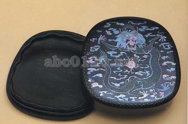 この硯は旧坑から採取した歙州石ぞつくられたものである。石色は青紫を帯びた黒色で硬く潤いがあり、墨のおりもよく文理も均衡で細密、牛毛紋、古犀羅紋も見えかくれしている。硯匠は材質の特徴を生かし全体をめくり上った蓮の葉に形づくり、葉にかくれるように墨池が設計されている。墨堂は平らでなめらかであり、十対近くの眉子紋が墨堂一面に広がり、ほとんどが横に真直ぐのび、両端がわずかに細くなっていて、まさに美女の眉毛のようである。清の徐毅は『歙硯輯考』で「歙州石は眉子をもって絶となす」といい、古来からこの種の文理をもつ歙州硯を佳品とした。硯の裏はややヘこみ、同じように眉子紋が何組もあり、その中間に蔓が彫刻され、本物そっくりである。出所:『北京博物院・清朝宮廷文化展』