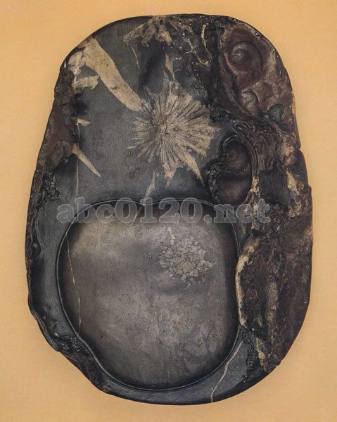 菊花石は湖南瀏陽に産出する。石に白い菊の紋様があることからこの名が生まれた。 この硯は卵形の石材を加工したもので、石色は茶線色を呈し、円形の墨堂は秋本をたたえた池(秋潭)のようである。墨堂内と外にそれぞれ一輸の白菊があり、墨堂に水を注ぐと、水に映える菊に見え、風雅な趣きがある。墨堂の上方にひとつ天然の空洞があり、 それが墨池である。この硯は造形が自然で、刀法も簡潔であり、構図はなかなか巧みである。出所:『北京博物院・清朝宮廷文化展』