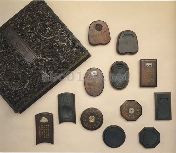 乾隆帝は数多くの古硯を収集し、また、造辦処の硯匠や呉中(現在の蘇州)などの地の優秀な硯匠に大量に模造させた。この一式の硯はいずれも内務府で、歴代の名硯をもとにつくらせた仿古品である。