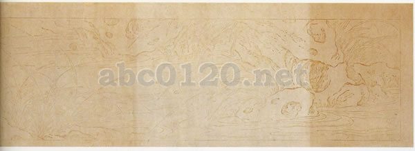 細い簾様の縞のある樹皮紙で、均―した細かい繊維である。紙は厚め、黄土色に染め、紙を型に押しつけ、蘭花図の隠し模様をつけてある。表面には粉を少量施してあり、墨書きに適している。