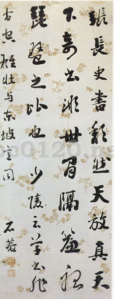 「行書幅」は劉墉の作品でも佳作に入る。力のこもった筆で、気品がただよっている。款の下には「石菴」が陰文で、「劉墉印信」が陽文で押捺してある。清の張維屏は、「劉文清の書は貌豊骨勁、味厚神蔵で、古人にてらわず、独特の風格をもっている。本朝の書法家では王文安と劉文清が最高である」(『松軒随筆』)、 と書いている。出所:『北京博物院・清朝宮廷文化展』