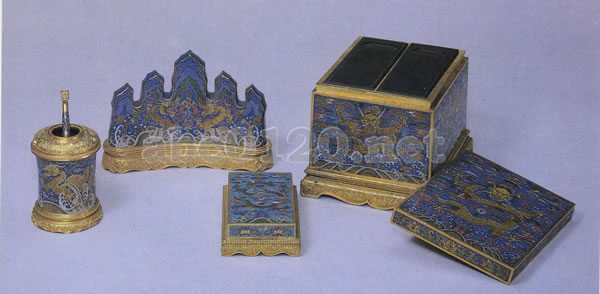 清朝になって、世の中が安定発展するに従い、文化芸術もまた未曾有の高揚を極め、女房諸具もその例外ではなかった。玉、瑪瑙、水晶、磁器、木、竹、象牙、金、銅、漆等の各種材料を惜しみなく用い、彫刻、搯絲琺琺(景泰藍)、彩画、描金等の技法と、人物、花鳥、山水、詩書等の題材が不断に駆使されて、文房清玩=文玩の黄金時代がもたらされた。文人趣味の乾隆帝は地方に行幸するたびに各地にその優秀なものを求め、また臣下む競って珍品を貢納した。紫禁城はこうして文玩の一大宝庫となった。出所:『北京博物院・清朝宮廷文化展』