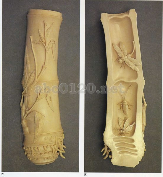 竹根のごく自然な湾曲を形どって彫りあげた象牙の臂閣である。下部がかすかに細くなり、根節がせまく密になっている。細根や切り取り跡の形は自然で、下部の二節を残し、側枝を一本つけ、主幹にそって上に伸ばし、枝分かれもある。真っすぐの葉、折れ曲がった葉、虫の食い跡のある葉、いずれも絶妙である。裏側は二節空心になつていて、そこにトンボ、カミキツムシ、蝶がそれぞれ一匹ずつ彫りつけられ、生き生きとした造形である。