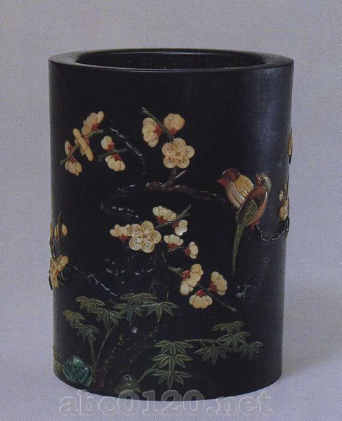 紫檀木は中国名で青龍木ともいい、 高級な彫刻材料になり、清の宮廷の器物には紫檀でつくったものが多い。この筆筒は渋い黒みをおび、彫刻は円潤で、花を環状にした五本の足とあわせ、華麗でしかもすがすがしい感じを与えている。清代文人の書斎机に置く実用の文房具であると同時に、芸術的価値の高い装飾品でもある。出所:『北京博物院・清朝宮廷文化展』