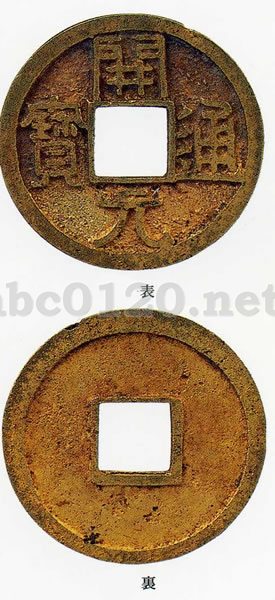 開元通宝の名称については、上下左右の順に対読して「開元通宝」とする説と、時計回りに回読して「開通元宝」とする説が対立しているが、日本をはじめ、影響を初期に受けた貨幣が回読になっていること、8世紀半ばに日本で出た大平元宝(銀銭)、万年通宝(銅銭)が、それぞれ開元通宝の回読と対読によりながら、回読による大平元宝を上位の貨幣としていることから、本来は開通元宝で、のちに開元の年号が使われるようになってから、開元通宝の読みが一般化したと推定できる。これをみても、日本の古代銭が受けた影響の大きさず知ら4るであろう。出所:『遣唐使と唐の美術』